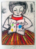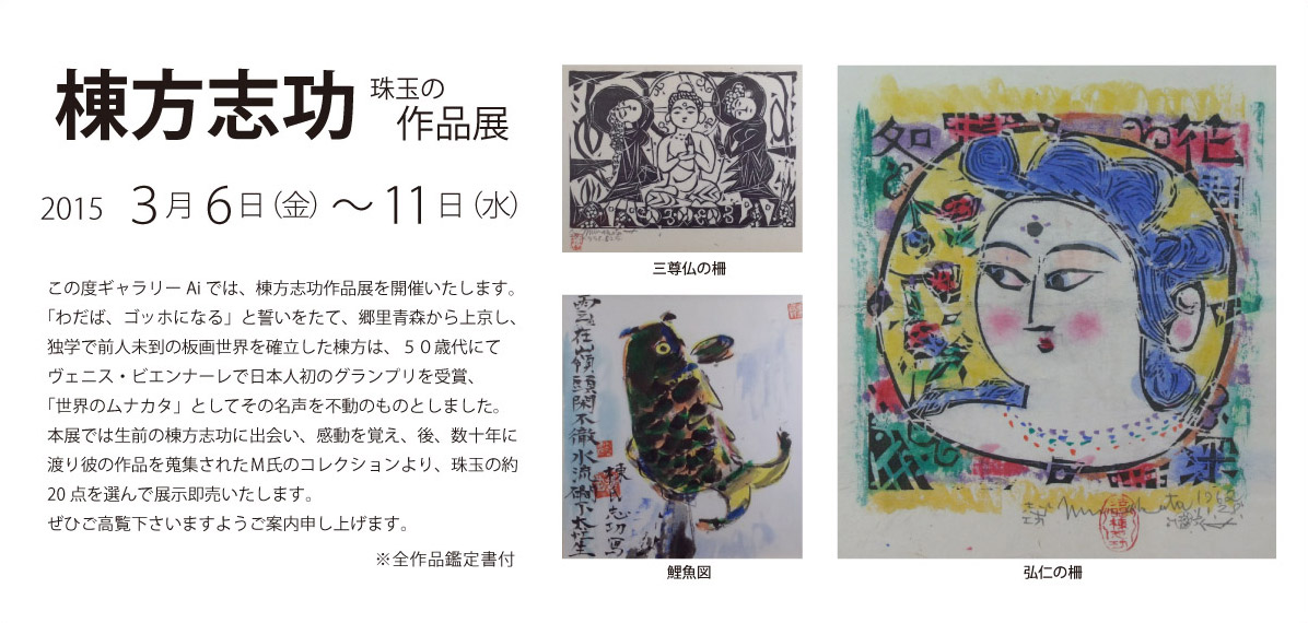 没後40年を経てもなおその人気は不動で、「世界のムナカタ」として国際的にも高い評価を得ています。独学で油絵や版画を習得し、独自の感性で自らの作品を「板画・ばんが・いたが」と称し、また「倭画・やまとが」と称する肉筆画や、書も数多く残しています。生前の作家と作品に出会ったM氏はその後数十年かけて棟方作品を蒐集されました。この度ギャラリーAiにおいてそのコレクションから一部を選んで展示し、稀有の芸術家の偉業に親しんでいただくことになりました。作品は販売もいたします。全作品に鑑定証明書が付いております。